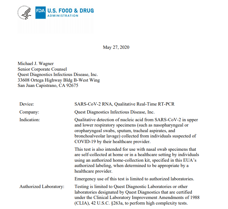 美国FDA上周批准了Quest Diagnostics公司的新冠病毒检测试剂盒,这将使个人可以在自己的家中进行COVID-19检测。当用户通过鼻拭子获取样本后,用户可以将样本连夜快递到检测实验室,然后他们将收到他们的检测结果。在获得批准后,Quest Diagnostics公司表示,它计划在6月底前提供50万套检测试剂盒。