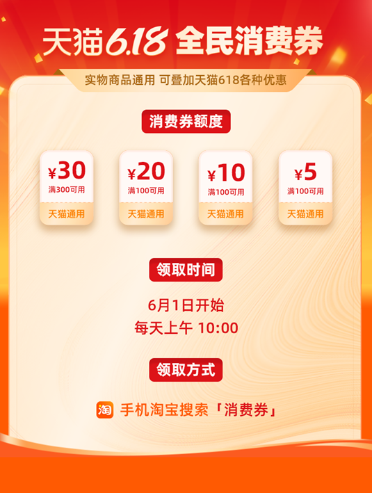 天猫618现金消费券的使用非常简单。据官方介绍,消费券的使用范围涵盖所有参与天猫618的商品,额度分为30元、20元、10元、5元四档。在618活动商家让利、全场每满300减40等优惠后,还能叠加现金消费券,付款时直接在优惠价格基础上抵扣相应额度。从6月1日起,消费者每天早上10点可上淘宝领。