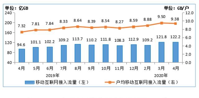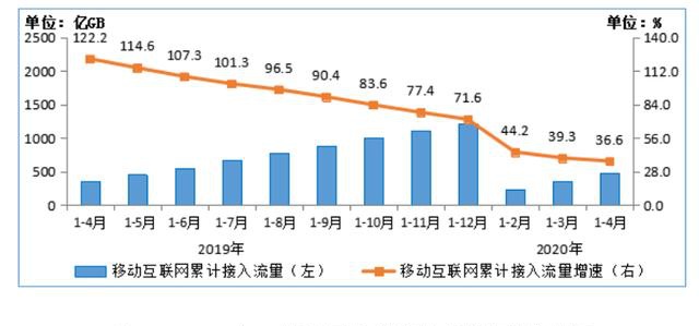 流量单价已经从4G时代初期的15元/GB降低到2019年年末时的4.8元/GB左右。2020年前4个月的数据显示,流量单价依然处于可快速下滑通道中。然而,即便流量单价已经降低到如此程度,流量的增速走势却长期处于直线下滑中。伴随移动互联网的飞速发展,机不离手早已成为大家生活和工作的普遍现象。在宽带用户规模的爆发式增长之后,其分流作用已经让流量难有爆增空间。