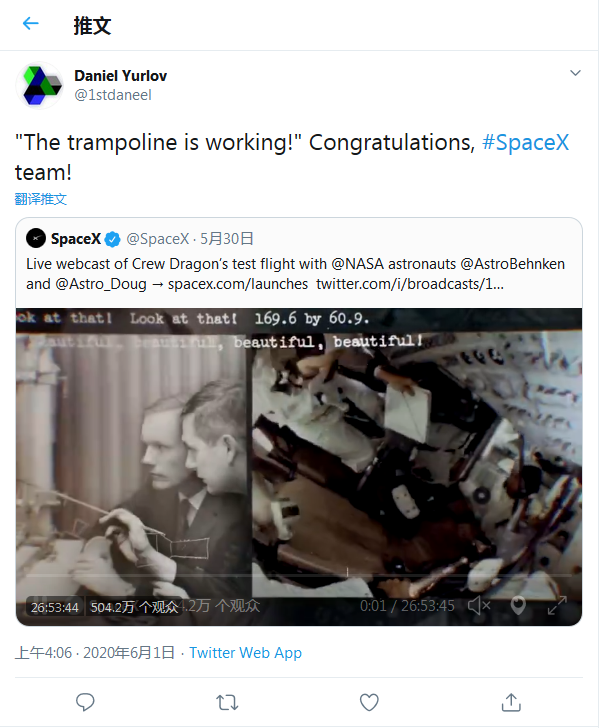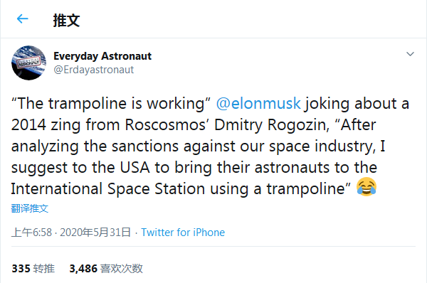俄罗斯航天局局长德米特里·罗戈津(Dmitry Rogozin)曾嘲笑美国没有载人飞行计划,称“不如用蹦蹦床将宇航员送上国际空间站”。不过在隐忍了6年后,伊隆·马斯克和美国宇航局终于笑到了最后。马斯克在随后的新闻发布会上,和美国宇航局局长吉姆·布里登斯廷(Jim Bridenstine)一起夸赞道:“蹦蹦床成功了!”