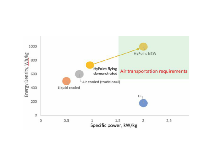 燃料电池堆的阴极侧的额外氧气与HyPoint公司开发的新型高温质子交换膜(HTPEM)技术相结合,使可以通过燃料电池的氢气量是传统设计的三倍,在不增加任何可能使VTOL飞机重量下降的寄生冷却质量的情况下,将其特定功率输出增加三倍。