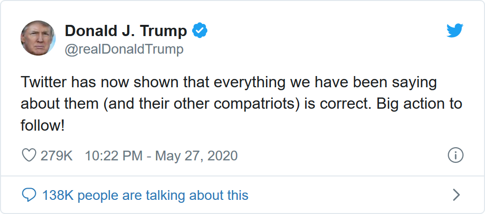 此前,Twitter给特朗普总统的两条推文进打上了需要核查的标签,另外还对其发布的一条关于明尼苏达州抗议推文发出警告,称其违反了网站的相关规定。