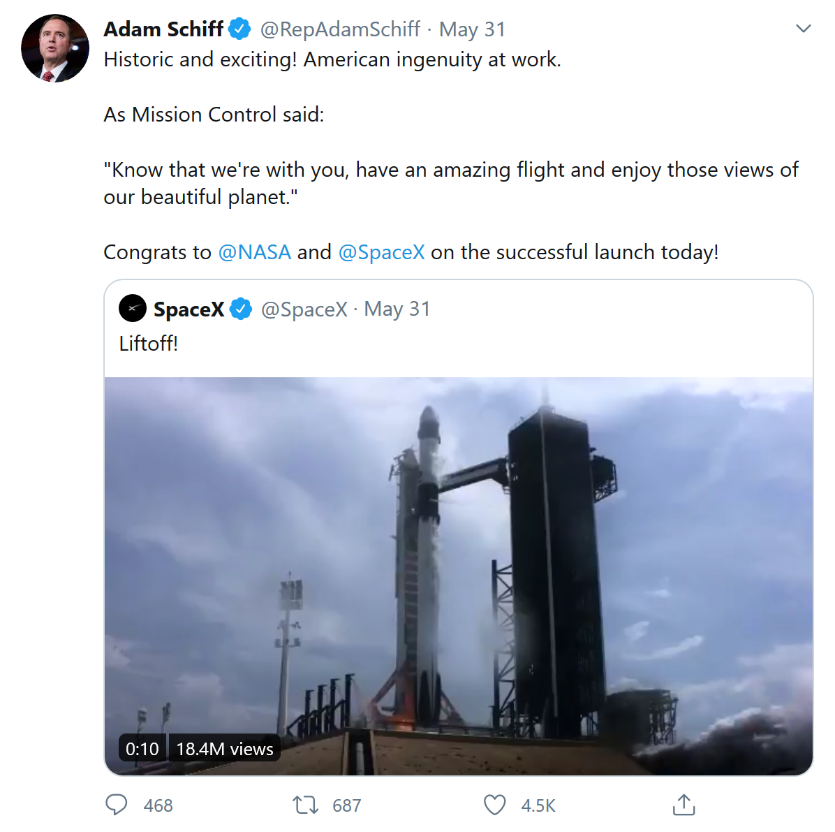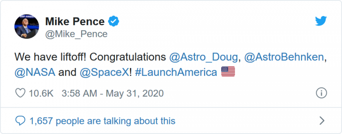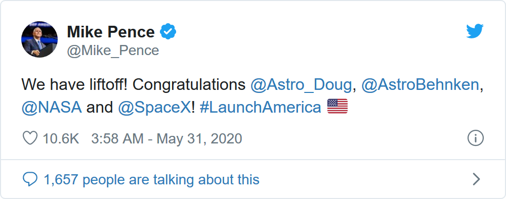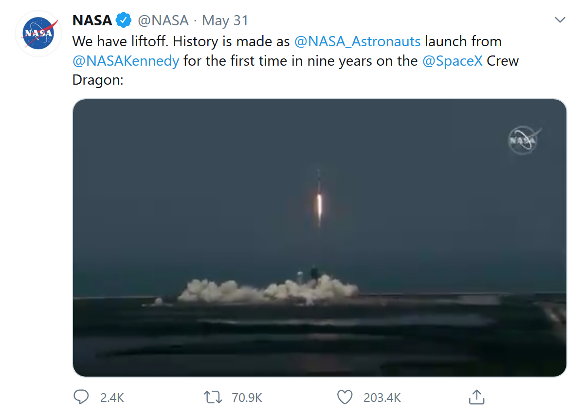 作为参与其中的成员,NASA当然有话要说,它在Twitter上分享了火箭发射的片段并附上标志性、激动人心的短语--“我们已经发射了”。