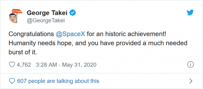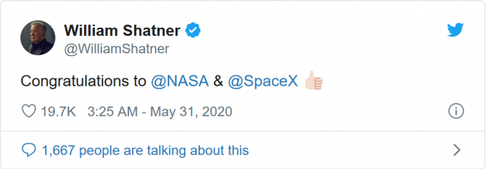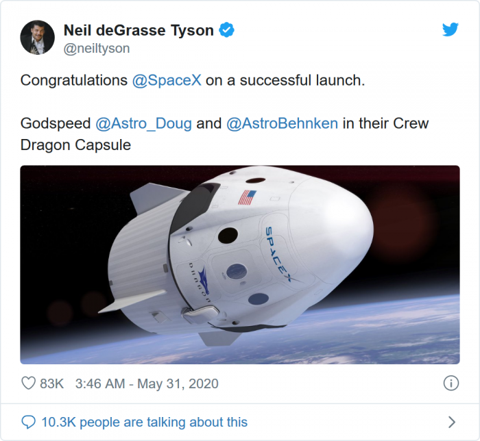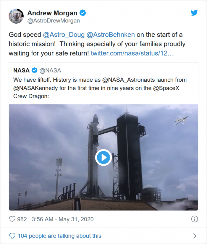 NASA的一些宇航员也在Twitter上分享了一些对两位乘坐龙飞船前往ISS的宇航员的祝福: