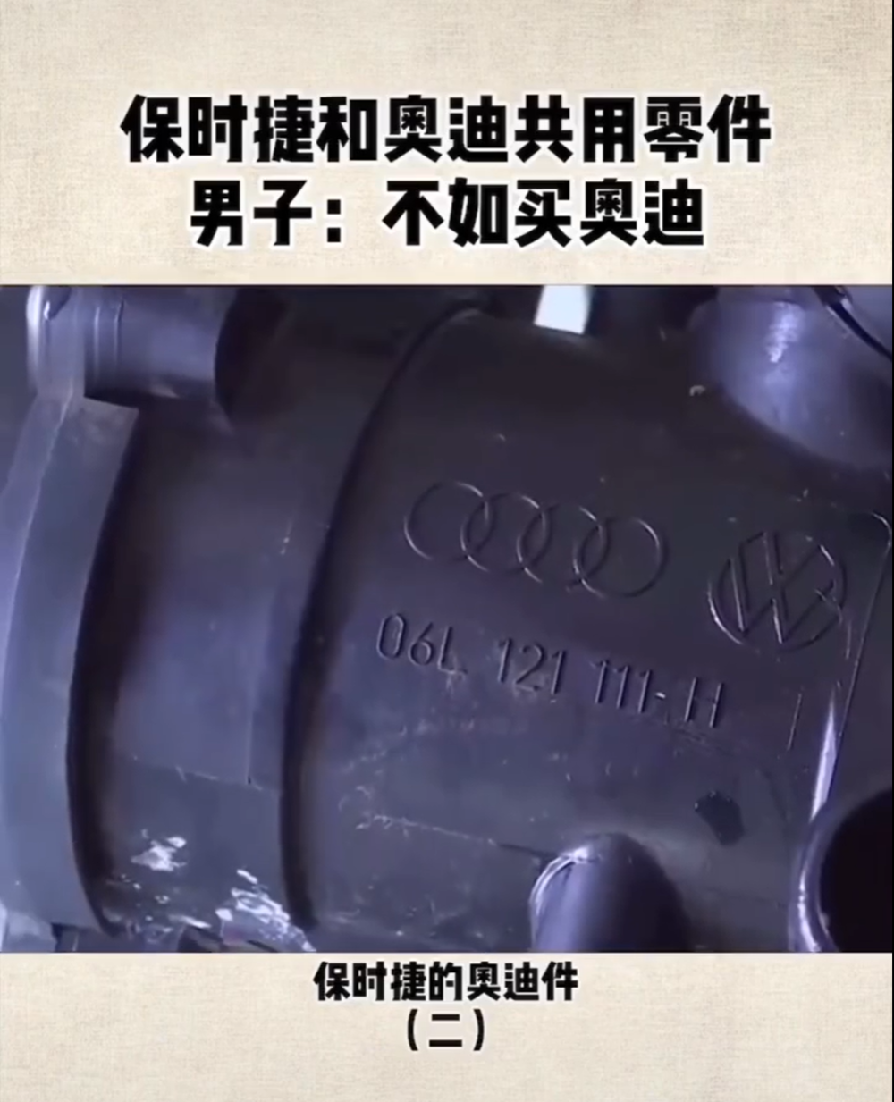 段先生最初拆出水泵的那家修车厂工作人员,面对镜头也说“他们(大众和保时捷)是一家的”;但毕竟人家是无辜的第三方,谁也不愿意站队给自己惹事,赶紧话锋一转,“但是我……没研究过这个东西。”前半句是人家对这种事情毫不意外,后半句是内心 os:这事儿跟我也没关系,别问我我啥都不知道。