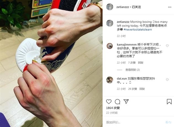 照片中,章泽天双手握拳拿着拳击手套,手上的青筋格外明显,关节处更是因发力过猛而打伤肿胀渗出的淤血明显,在白皙肤色衬托下颇有些触目惊心,可见练习时候的投入。