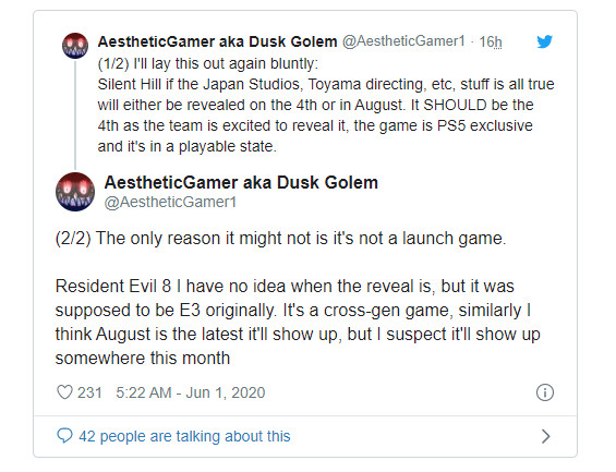 至于另外一个恐怖游戏大作——《生化危机8》,很有可能也会在本月某个时候公布。根据Golem,《生化危机8》原计划是在今年E3上公布,是跨世代游戏,但由于E3被取消,Capcom有可能会在本月或8月公开,但本月公布的可能性更高。
