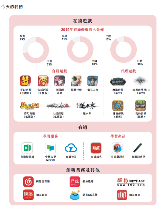 网易从中文门户网站、媒体及电子邮件服务起家,现在发展成为全球领先的游戏开发和运营商,2006年推出的有道业务,已成为在纽交所上市的智能学习平台;2013年推出音乐流媒体平台网易云音乐;2016年,开设电商平台严选,迅速成长为主流的自有品牌商品平台。自营互联网属性零售品牌、资讯传媒平台等,覆盖全中国超过 10 亿用户。