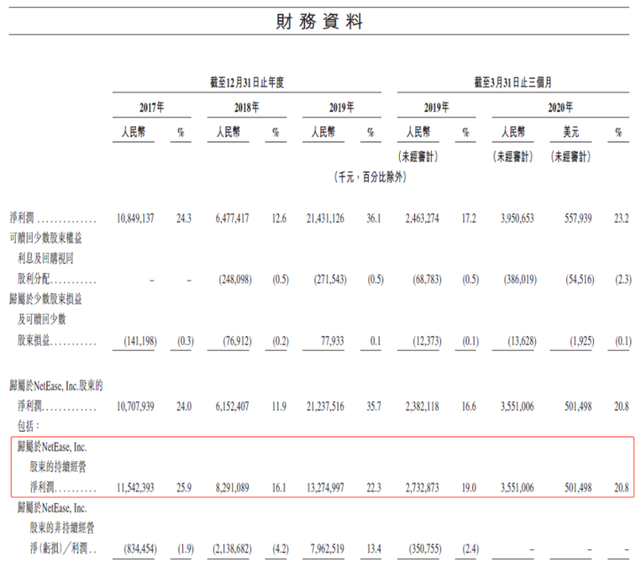 2019年核心业务表现强劲,2017-2019年,归属于网易公司股东的持续经营净利润分别为人民币115.42亿元、82.91亿元、132.75亿元。2019年,得益于核心业务表现强劲,持续经营净利润同比增长60.1%。2020年第一季度,归属于网易公司股东的持续经营净利润为人民币35.51亿元,同比增长约30%。