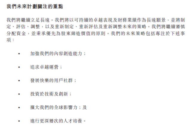 网易未来策略将专注于:1)加强内容创造能力;2)追求卓越运营;3)发展快乐的用户社群;4)投资于技术及创新;5)扩大全球影响力;6)进行更深层次的人才培养。