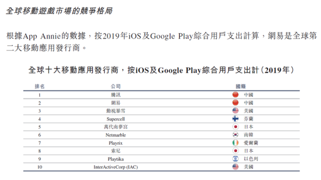 2019年,全球前三大游戏市场:中国,美国和日本,约占全球游戏市场总和的60%。2019年全球游戏市场规模为1,521亿美元,预计到2022年将以8.8%的复合年增长率进一步增长至1,960亿美元。2022年,全球手机游戏收入预计将达954亿美元(几乎占全球游戏市场的一半)。根据App Annie的数据,按2019年iOS及Google Play综合用户支出计算,网易是全球第二大游戏公司。