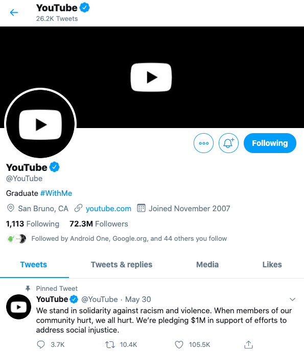 与此同时,Google 旗下的视频平台 YouTube 也在 Twittter 平台上将 logo 设定为黑色,来表达对黑人群体的支持。YouTube 还在官方 Twitter 上表示,将捐赠 100 万美元来支持寻求社会公平正义的努力。