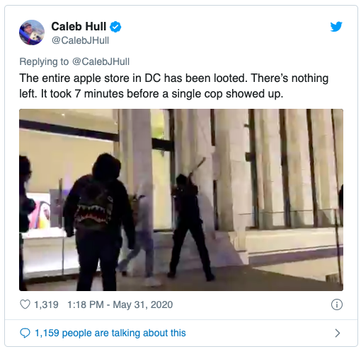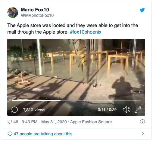 除此之外,周六晚上,有多处 Apple Store 被造成破坏和抢劫,包括亚利桑那州的 Scottsdale、华盛顿特区、费城、旧金山等地方。