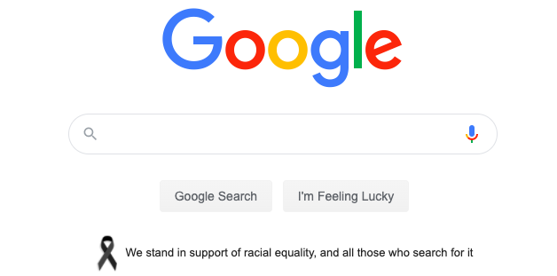 Google 也在其搜索引擎 Google.com 首页给出了自己的声音,并附上了一个黑丝带的图标:我们支持种族平等,以及所有寻求种族平等的人。