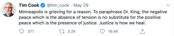 实际上,针对这次 George Floyd 之死和随之而来的大规模抗议,苹果 CEO Tim Cook 早有观察到,并早就表达了对正义的支持——实际上,他也是为抗议者第一个发声的知名美国科技公司高管。