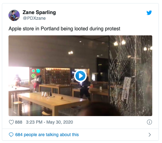 可见,对于人们因为 George Floyd 之死而进行的大规模抗议,Tim Cook 是表示支持的。但恐怕连他自己也没有想到,抗议本身变成了暴力行为,而且这种暴力行为也指向了 Apple Store。
