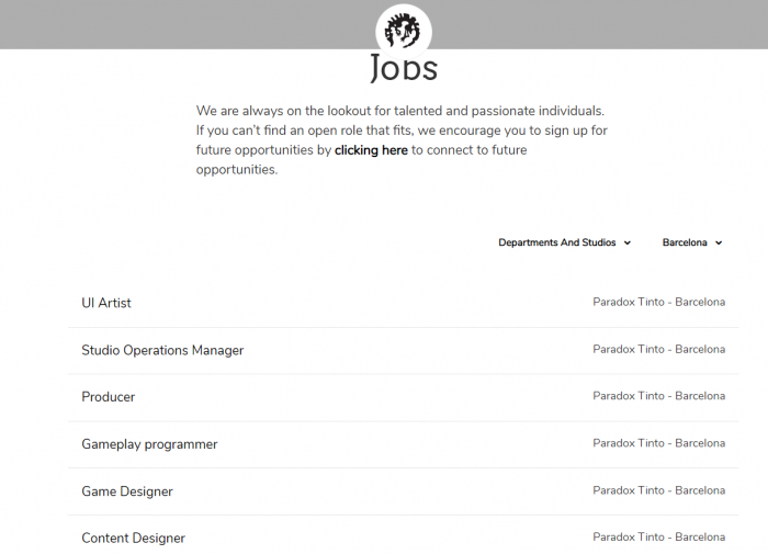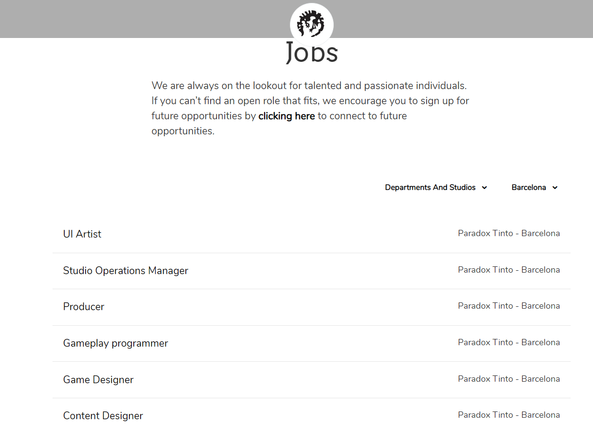 目前,巴塞罗那新工作室“Paradox Tinto”已经发布招聘公告,开始招兵买马,此次官方公开的职位包含:UI艺术设计师、工作室运营经理、制作人、游戏玩法程序员、游戏设计师和内容设计师。