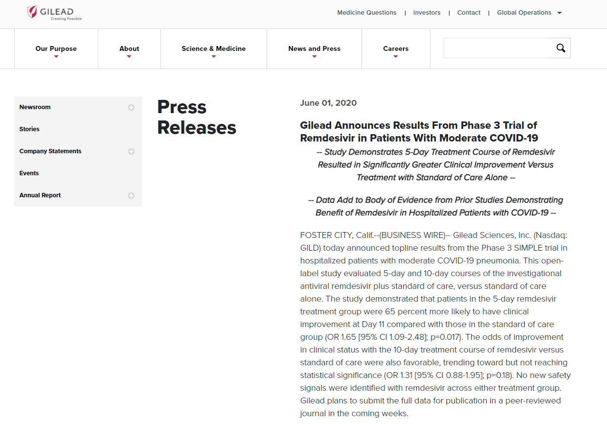吉利德公司在一份单独的声明中指出,该药的SIMPLE-Severe研究纳入了COVID-19患者,需要无创通气治疗的患者,研究结果显示,5天的瑞德西韦疗程导致的改善效果与10天的疗程相似。