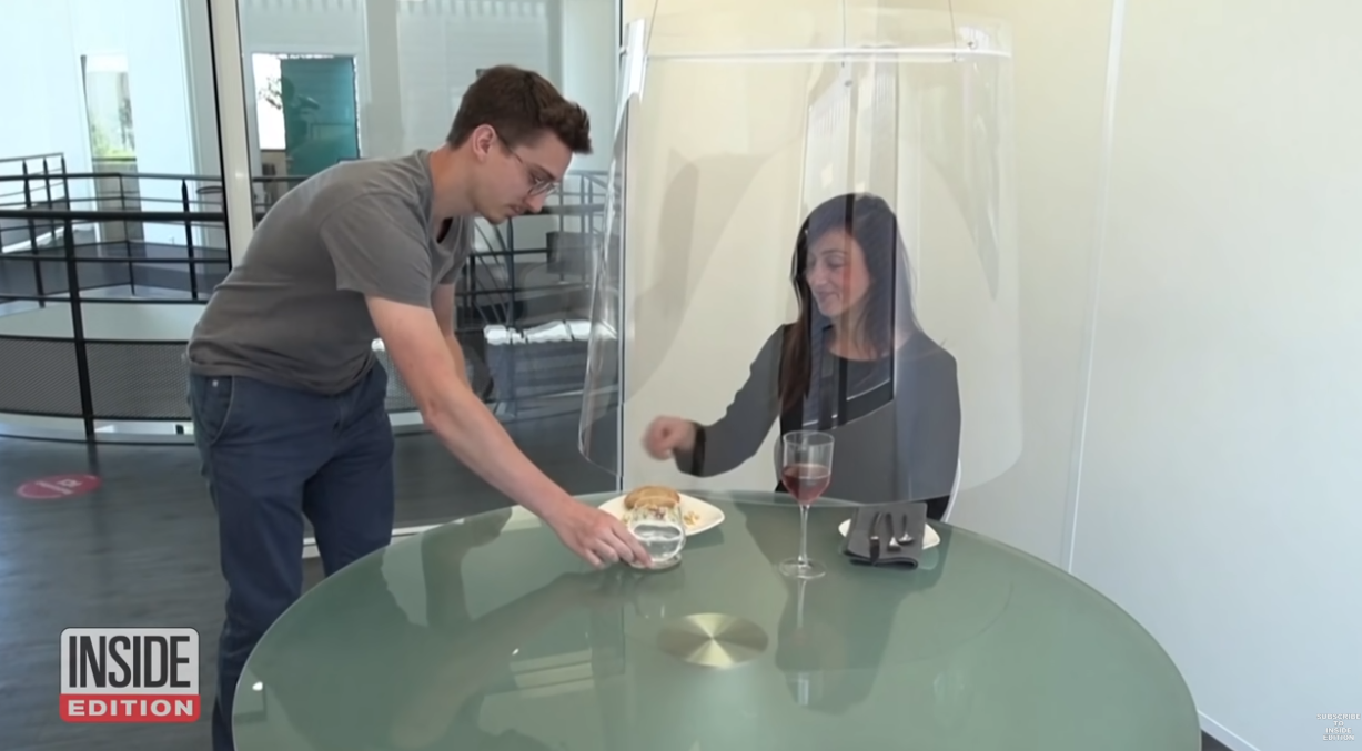 这款名为 "Plex'Eat "的产品正在投入生产,很快就会卖给更多的餐厅。这种方法有很多弊端,但发明者称他有几个不同国家的餐馆对他感兴趣,并计划生产这种防护罩用于零售。所谓的 "Plex'Eat "餐饮圆柱体的设计是作为一个保护罩,可以阻挡冠状病毒和其他空气传播疾病的传播,同时还能让你和朋友和家人一起外出就餐。