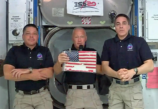 图:NASA宇航员罗伯特·本肯(左)、道格拉斯·赫尔利(中)和空间站指令长克里斯·卡西迪