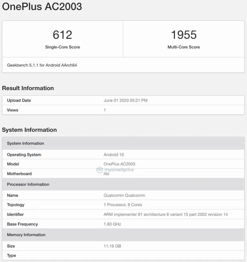 从跑分信息来看,该机搭载代号为“Lito”的高通骁龙八核处理器,时钟频率为 1.8 GHz(此前谣传为高通骁龙765G),内存为12GB。在GeekBench 5.1.1单核成绩为612分,多核成绩为1955分。