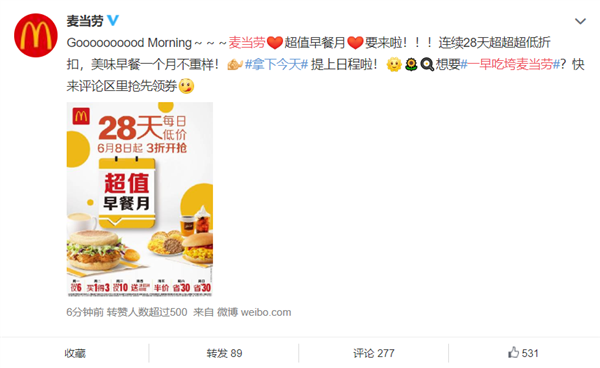 6月2日,麦当劳官方宣布,将于6月8日开启“超值早餐月”活动。连续28天,每日低价,3折开抢,低至5元。有网友表示:“那我每天都要吃十份早餐。”此外,超值早餐月期间,麦当劳每天都有不同优惠玩法,比如:周一,麦满分组合6元;周二,小食买1得3;周三,早餐三件套10元;周四,买汉堡送冰淇淋咖啡;周五,炒双蛋堡半价;周六周日家庭餐立省30元起。