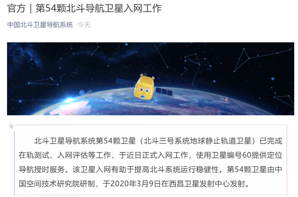 6月2日消息,记者从中国北斗卫星导航系统官微了解到,北斗卫星导航系统第54颗卫星(北斗三号系统地球静止轨道卫星)已完成在轨测试、入网评估等工作,于近日正式入网工作,使用卫星编号60提供定位导航授时服务。该卫星入网有助于提高北斗系统运行稳健性。