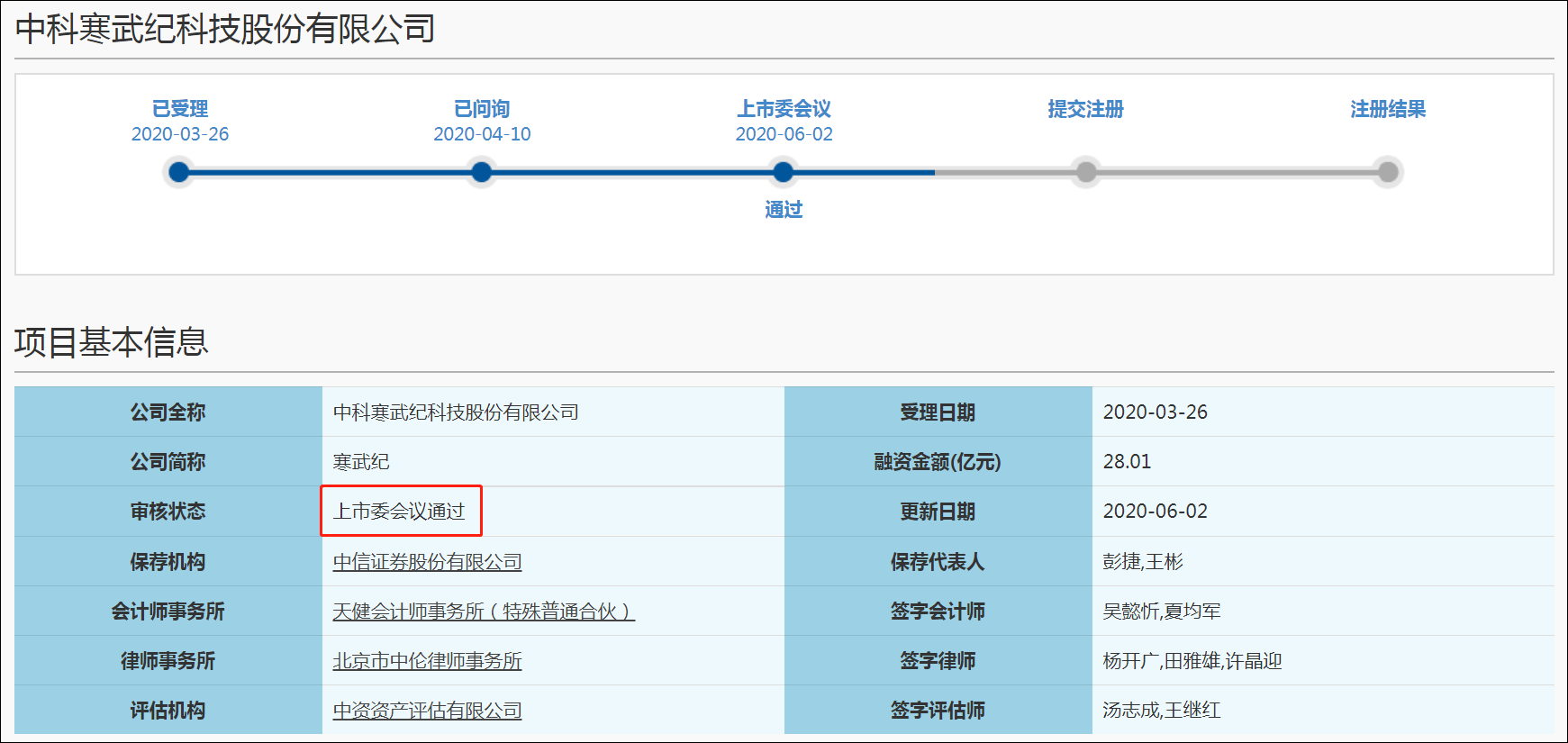 6月2日,观察者网在上交所网站查询到,中科寒武纪科技股份有限公司(下称:寒武纪)、路德环境科技股份有限公司(下称:路德环境)在科创板首发过会。从时间看,寒武纪科创板上市申请于2020年3月26日获上交所受理,此次上市融资金额为28.01亿元。