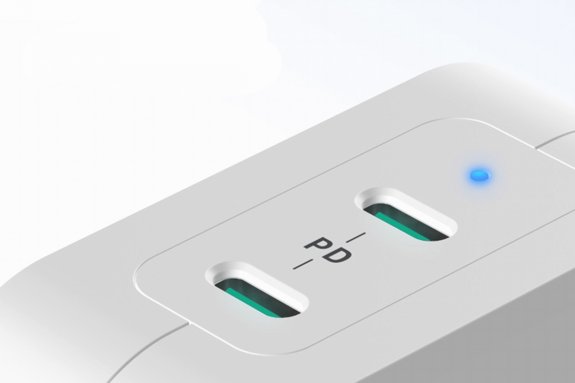 RAVPower品牌主打色调为蓝绿色,在两个USB-C接口上使用了绿色插座器件,并标注了“PD”字眼。在插孔上方是一个工作指示灯,通电后会亮起淡蓝色的灯光提醒用户当前处于工作状态,亮度柔和就算夜间也不会刺眼。