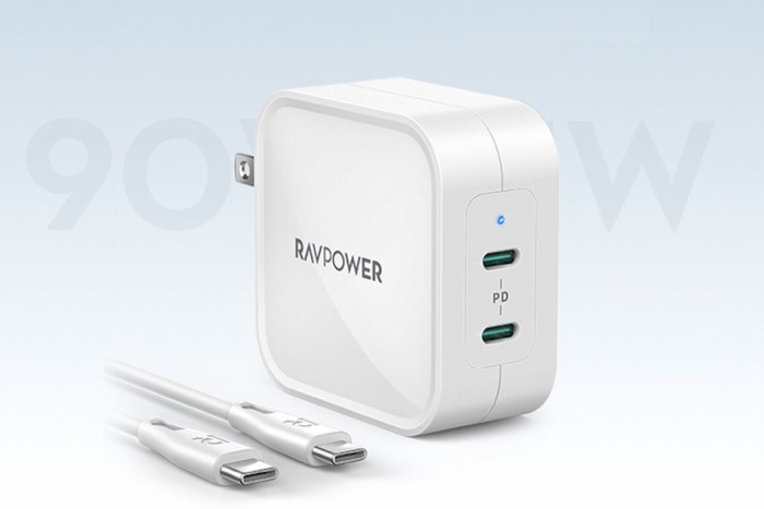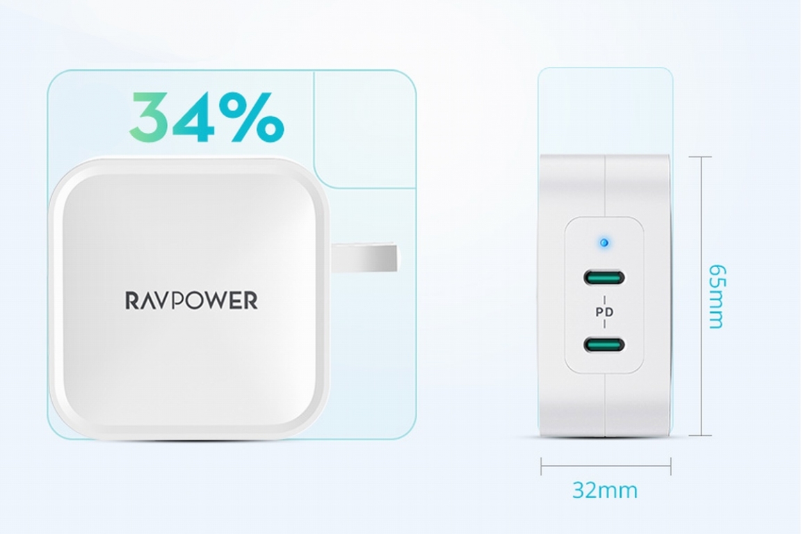 RAVPower 90WPD充电器支持双口同时输出,可同时为两台设备充电,iSmart智能动态分配功率技术可根据当前设备调整各个接口的功率值,拥有45W + 45W、60W + 30W、30W + 60W等不同功率分配设定,面对不同设备都可以匹配最佳充电效果。