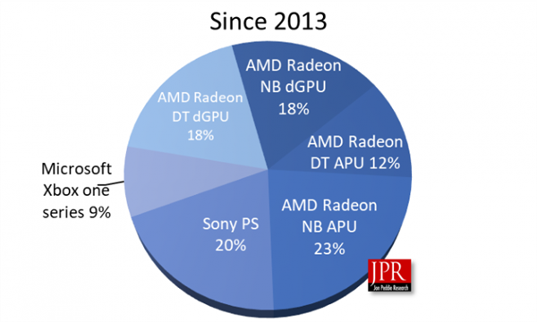 按照产品范围划分,AMD GPU的出货量有29%来自微软和索尼主机,两家分别占9%、20%,合计达29%。