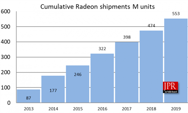 市调机构Jon Peddie Research今天发布了一组有趣的数据,显示了AMD 2013-2019年八年间GPU图形处理器的出货量,包括独立显卡、消费级APU、游戏机APU三大类。数据显示,AMD GPU 2013年的出货量仅为8700万颗,此后一路稳步增长,到了2019年累计已经达到5.53亿颗。