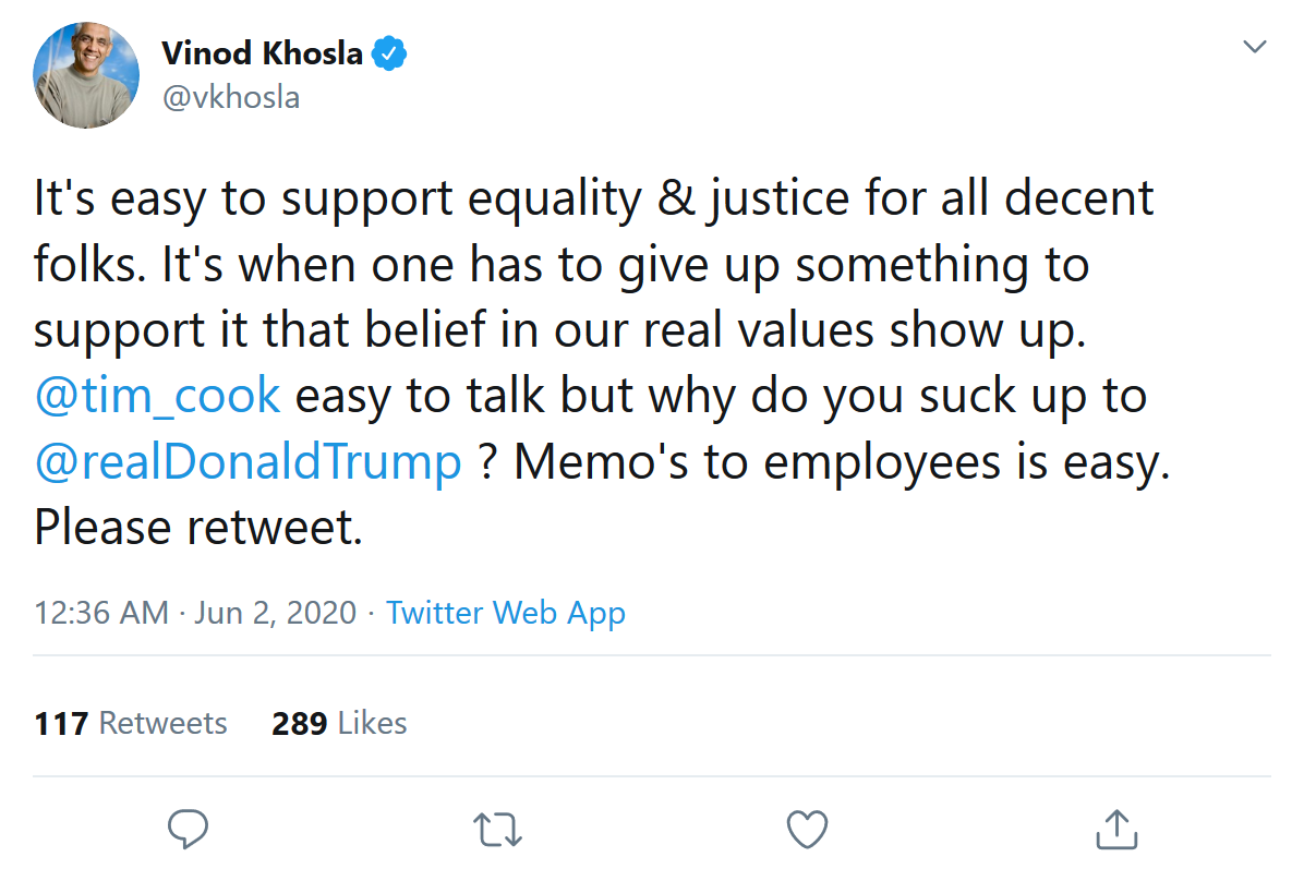 Khosla在Twitter上写道:“支持所有正派人的平等和正义很容易。只有当一个人不得不放弃一些东西来支持它的时候,对我们真正价值的信念才会显现出来。@tim_cook说起来容易,但你为什么要拍@realDonaldTrump的马屁?给员工发备忘录很容易。那么请转发。”
