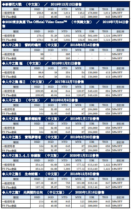 本次优惠贩售的重点游戏,当然就是首度以50%OFF优惠提供的『人中之龙7 光与闇的去向』。这款『人中之龙』系列最新作起用了新主角“春日一番”并将游戏类型更改为RPG,掀起了许许多多的话题,而在游戏发售后则是在业界内外获得“满满的游戏乐趣”等反响以及极高的评价。除此之外,『新樱花大战』、『审判之眼:死神的遗言 新价格版』、『Dragon's Crown Pro』,甚至是3月才刚推出的『受讚颂者斩』等等,超过40款以上的游戏将以特别价格进行贩售。