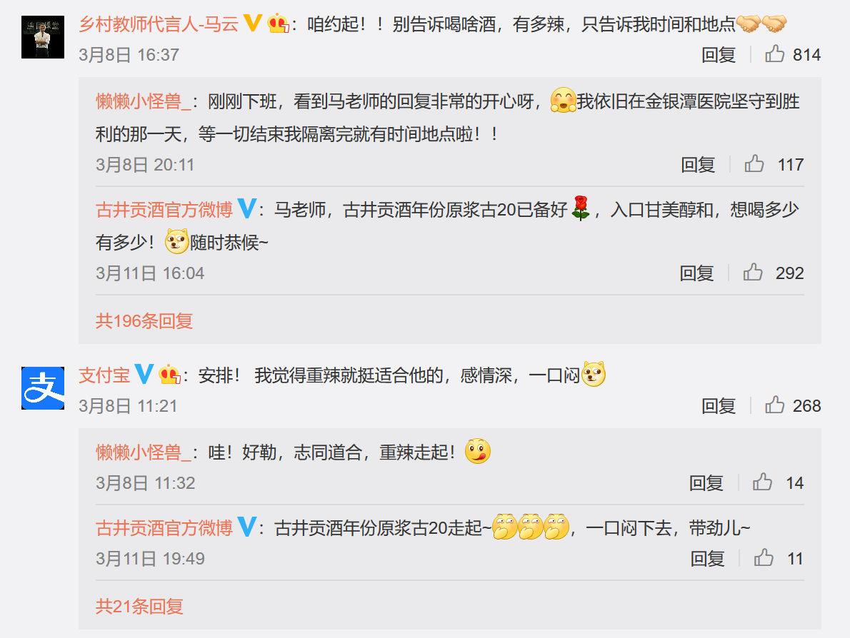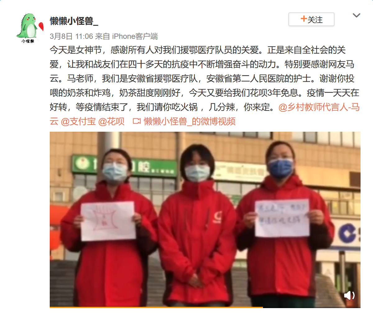 在白岩松的连线中,马云也曾谈及微博上回复王琪的火锅之约,并表示自己“特别期待这顿火锅”。希望医护在给病人带去温暖的同时,自己也能给医护带去温暖。