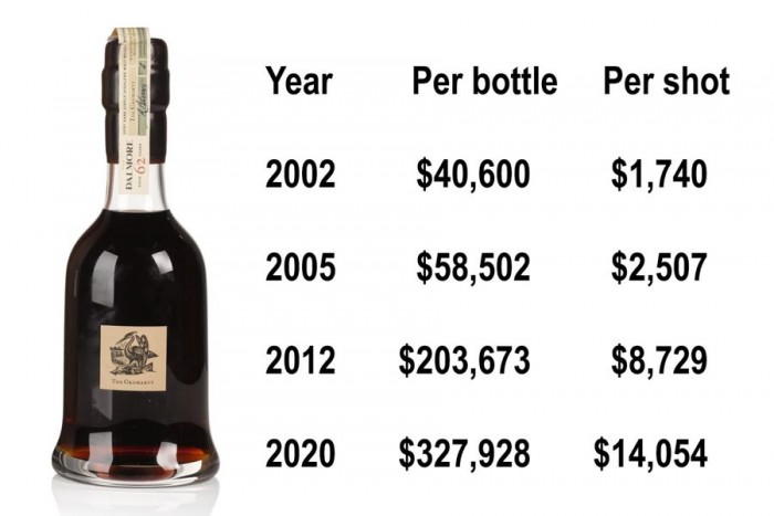 5月28日在苏富比拍卖行售出的两瓶 Dalmore 62 Year Old,分别叫做 “The Cromarty”和“The Mackenzie”,每瓶拍卖价格为266,200英镑(约合 2385697.10 元)。这比前两款酒的价格高出一倍以上,比2011年奢侈品购买高峰期时创下的前一纪录高出50%以上。