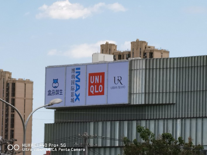 接下来就是华为P40 Pro+秀肌肉的阶段,上图便是10倍光学变焦下拍摄的照片。说句实话,当时我和我在场的小伙伴都惊呆了,你真的很难想象在如此遥远拍摄距离下能够将芳圆里左上角的四家品牌大广告牌拍的如此之清晰。如果将这张原图在手机上放大观看,上面无论中文还是英文字母依然清晰,没有锯齿和模糊的感觉。