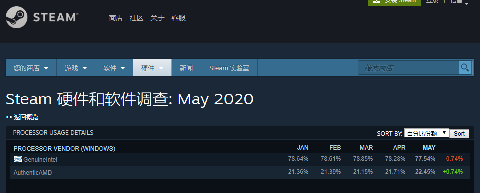 Steam公布了今年5月度的硬件和软件统计数据,其中在处理器子项上,AMD实现两连涨,最新份额为22.45%。由于x86处理器市场事实上就Intel和AMD两家,所以最终呈现出来的面貌就是此消彼长。