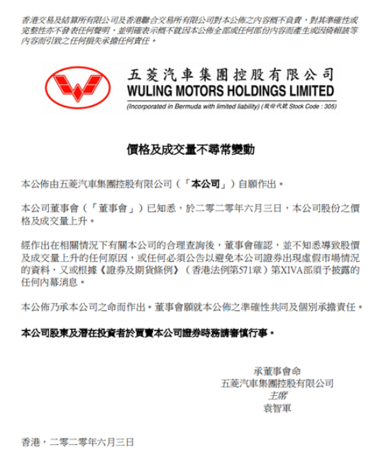 6月3日,五菱汽车在港交所公告称,经作出在相关情况下有关本公司的合理查询后,董事会确认,并不知悉导致股价及成交量上升的任何原因,或任何必须公告以避免本公司证券出现虚假市场情况的资料,又或须予披露的任何内幕消息。