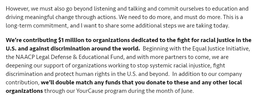 日前各大游戏公司正在拿出实质性的行动抗击美国当前的种族歧视问题。继育碧和SE之后,美国最大游戏公司之一EA近日宣布捐款100万美元,以反对种族歧视。EA在官网给全员工发布了一个通知,由EA CEO Andrew Wilson撰写。