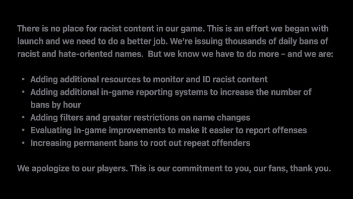 IW表示,尽管他们已经因冒犯性名字而封掉用户,但他们已经准备好额外的反制措施以确保种族歧视ID不会漏过其过滤器。这包括“追加额外的资源去监视和识别种族主义内容,追加额外的游戏内举报系统以增加每小时的封禁数量,对ID修改追加过滤器和更严厉的限制,评估游戏内的改进以更容易地举报,增加永久性封禁以根除屡教不改者。”
