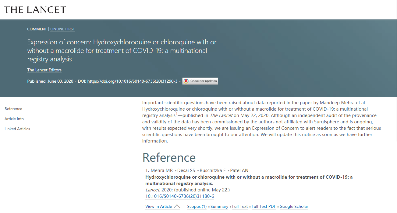 这项研究最初发表在5月22日的《柳叶刀》杂志上,研究观察了超过9.6万名患者,其中近1.5万名患者接受过氯喹或羟氯喹治疗。该研究促使世卫组织"暂停"对羟氯喹临床治疗试验,以便审查其收集到的安全数据。