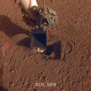 洞察号团队分享了一个过程的GIF,其中涉及到用着陆器机械臂末端的铲子推动探测器的顶部。这个好消息表明, "鼹鼠 "的问题不是石头挡住了它的去路,而是洞察号着陆点的火星土壤的组成。探测器无法获得足够的摩擦力来向下推进。