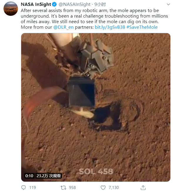 NASA洞察号团队账号周三在推特上发文称:“经过我的机器人手臂的几次助攻,鼹鼠似乎进入地下。从几百万英里之外的地方排除故障,真是一个真正的挑战。”