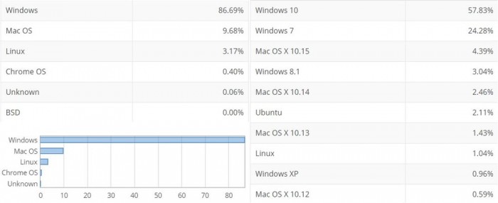 2020 年 3 月,Windows 系统的总市场份额为 89.21%,而由于更多的用户转而使用 Linux 和 macOS系统,因此在 5 月市场份额下降到了 86.69%。其中 Windows 10 系统的市场份额相比较上个月增长了 1.8 个百分点,达到 57.83%。