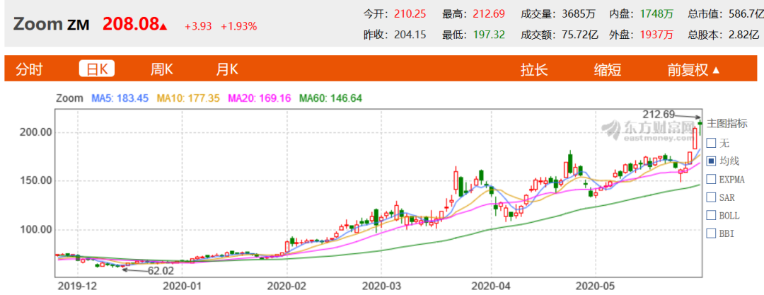 财报一经发布,Zoom股价立时上涨。截至6月2日美股收盘,Zoom股价为208.8美元,上涨近2%。受疫情影响,居家办公与远程授课使Zoom利用率骤增,使今年以来Zoom股价一路走高,截至6月2日,Zoom股价累计涨约200%。