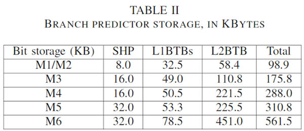 这篇论文更深入地介绍了分支预测器设计,展示了基于核的可缩放哈希感知器(Scaled Hashed Perceptron )设计。这些年来,设计一直在不断改进,提高了分支的准确性,从而不断降低了MPKI(mis-predicts per kilo-instructions)。展示的一个有趣的表是分支预测变量在前端内占用的存储结构量,以KB为单位:
