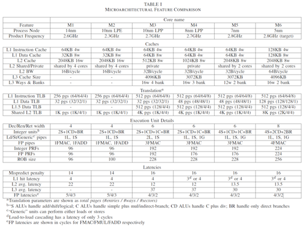 有趣的是,即使内核要宽得多,整数执行单元也不会发生太大变化,只是看到一个复杂的管道增加了第二个整数除法功能,而加载/存储管道将保持与上一个架构相同。具有1个加载单元,1个存储单元和1个1加载/存储单元的M5。在浮点/ SIMD管道上,我们将看到具有FMAC功能的第四个单元。TLB可能会发生一些大变化,例如L1 DTLB从48页(pages)增加到128页,而主TLB从4K页增加到8K页(32MB覆盖)。