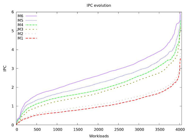 在IPC改进方面,SARC团队在过去8年的开发中设法实现了平均每年20%的改进。如图所示,M3的IPC实现了大幅度飞跃。M5与我们在基准测试中看到的大致相关,大约提高了15-17%。据披露,M6的IPC平均值为2.71,而M1的平均值为1.06,此处的图表通常似乎表明与M5相比提高了20%。