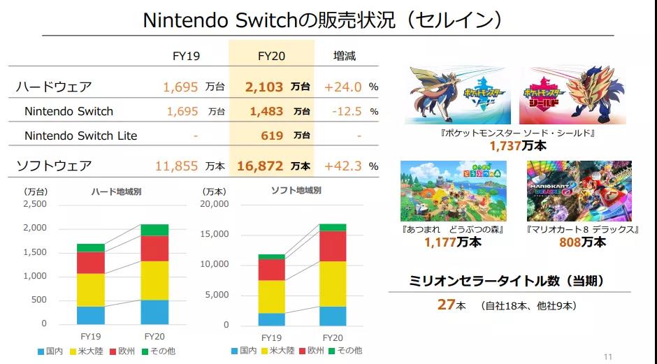 这份傲人的“成绩单”显示,截至2020年3月末,任天堂Switch主机累计销量达到5577万台。过去一年,Switch游戏主机销量为2103万台、同比去年增长了24%,其中Switch主机销量为1483万台,Switch Lite销量为619万台。全年软件销量为1.68亿套、同比去年增长了42.3%。